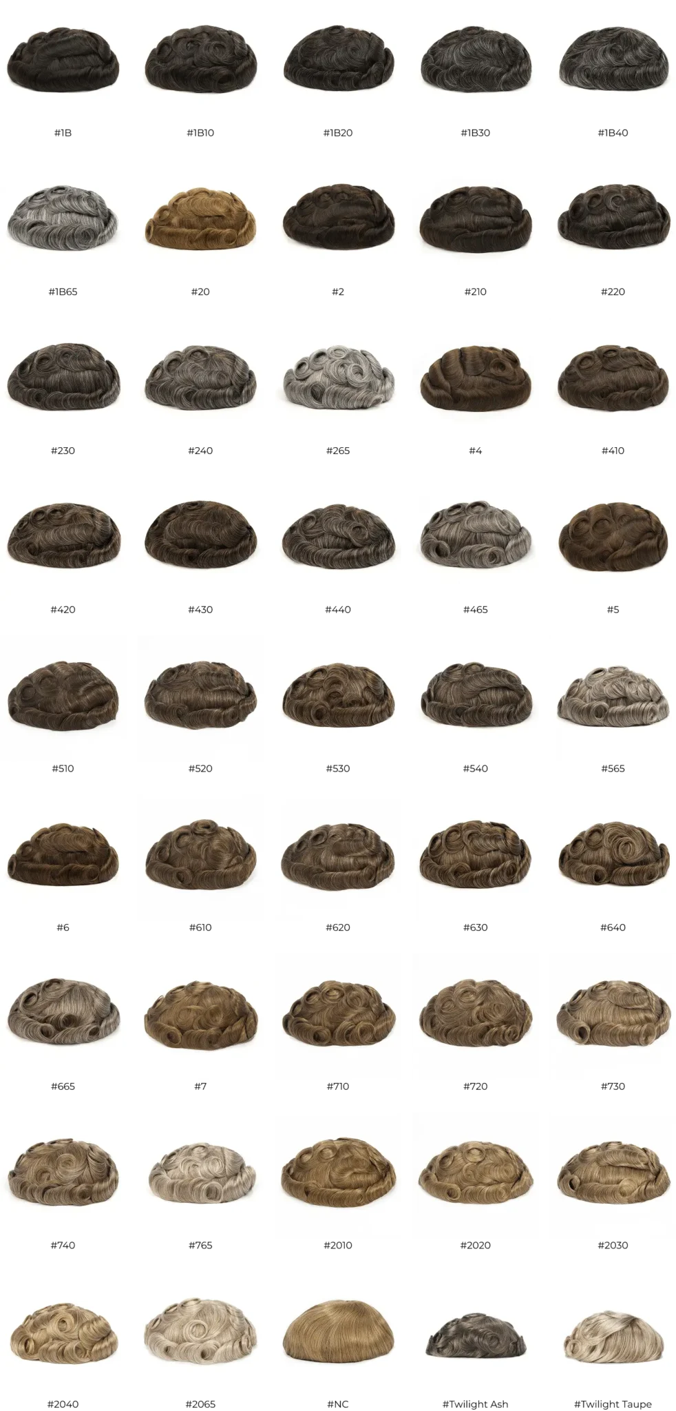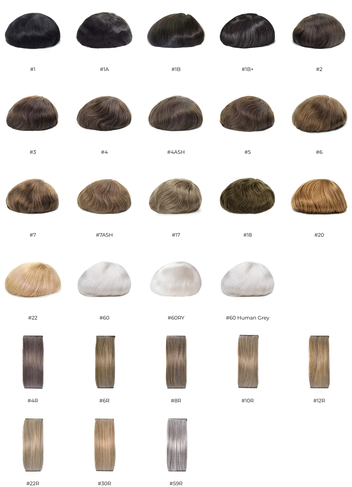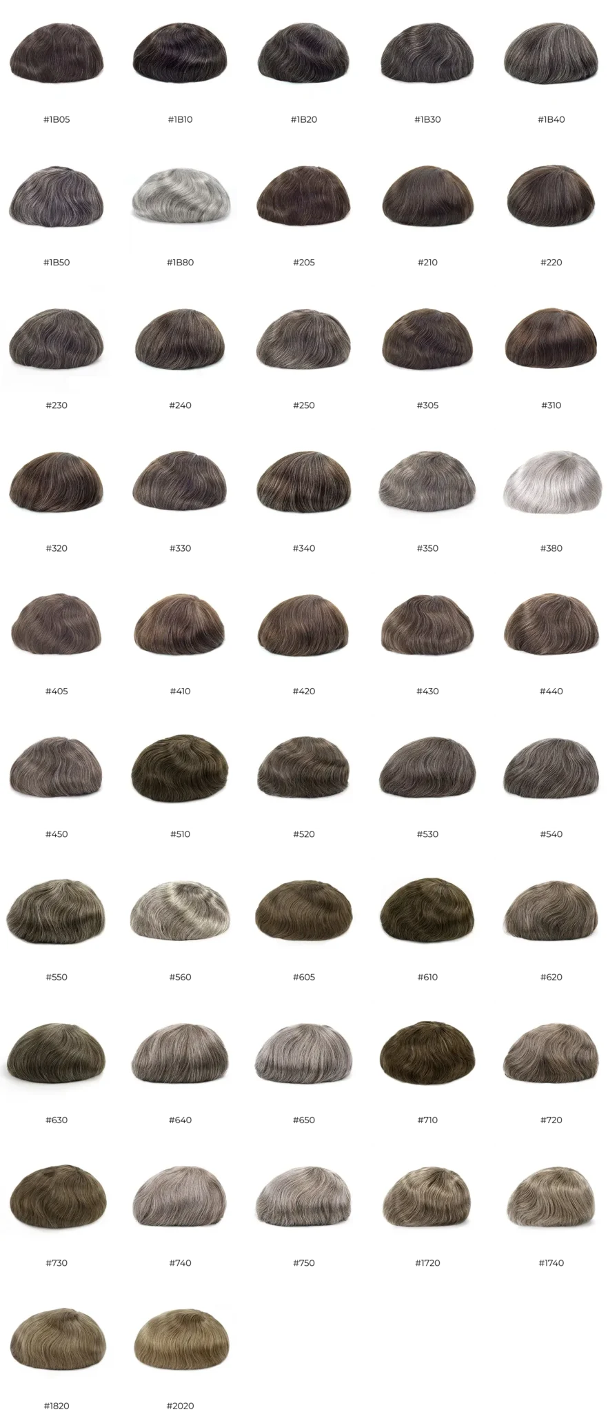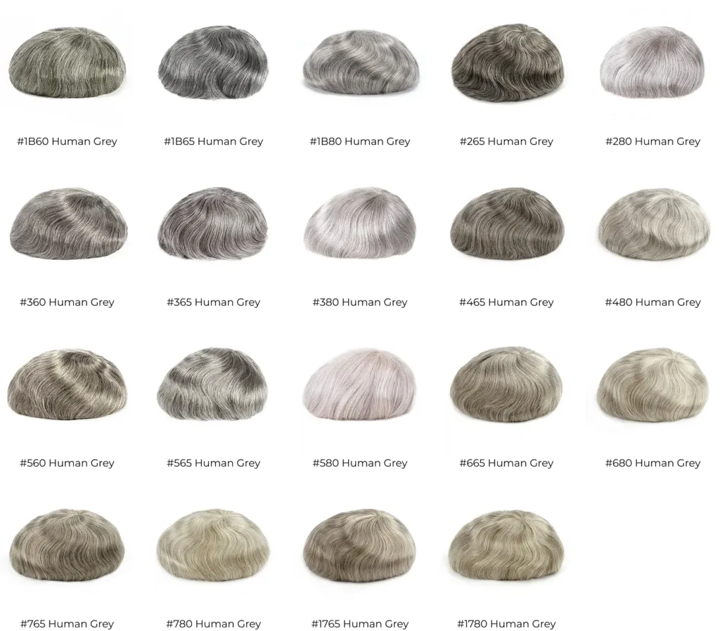 Hair system colors are typically coded with a base color number and an optional suffix that indicates the percentage of grey hair. The base color represents the color your Bio Hair would have, ensuring a seamless transition when wearing the system. You are free to choose a different base color, but if you still have natural hair—which will be visible when wearing the system—the base color should ideally match your natural hair color. Here’s how it works: